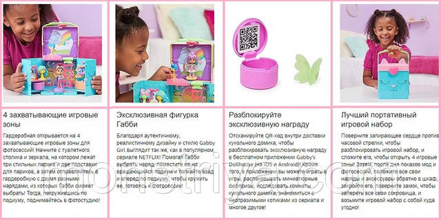 Представляємо портативний ігровий набір «Шкаф для перевдягання лялькового будиночка Габбі»! Гардеробна відкриває 4 захопливі ігрові зони для фотосесій, які просто необхідні шанувальникам популярного серіалу Netflix! Підійдіть до туалетного столика та дзеркала, де лежать три стильних перуки та дві підставки для перуків, щоб ви могли зробити Габбі зачіску та макіяж! Після цього вирушайте в гардеробну, де є три вішалки на стінах і ящики для зберігання речей, а також два різні вбрання, з яких Габбі може вибрати! Вибравши вбрання, застрибайте на обертовий подіум і штовхайте Габбі взад і вперед по подіуму, щоб крутити її! Потім не забудьте розпакувати доставку лялькового будиночка, щоб побачити свій аксесуар-сюрприз, як це робить Габбі в серіалі! Коли вона буде готова, скористайтеся пластиковою мотузковою драбиною, щоб піднятися в фотостудію, де ви зможете вибрати один із 4 різних фонів для своєї уявної фотосесії. Розташувавши штатив і камеру на балконі, Габбі готова прийняти позу! Після веселого дня показів мод і котячих фотосесій покладіть усе своє вбрання й аксесуари назад у шафу, закрийте його, поверніть замочок, щоб зберігати всі свої чудові скарби всередині, а потім скористайтеся прикріпленою ручкою. ігровий набір, хай куди б ви пішли! І останній сюрприз: відскануйте QR-код усередині доставки лялькового будиночка, щоб розблокувати спеціальну нагороду в безплатному застосунку Gabby's Dollhouse (доступно на iOS і Android). Іграшки, фігурки, м'які іграшки, аксесуари для лялькових будиночків та ігрові набори Gabby's Dollhouse — це чудові розвивальні іграшки для дітей від 3 років і старших, які люблять розширювати свою уяву за допомогою захопливих рольових ігор, а також призначені для спільної роботи з ляльковим будиночком Gabby's Purrfect, так що візьміть їх із собою додому. ідеальний ігровий набір, який можна взяти із собою в дорогу, з шафою для перевдягання лялькового будиночка Габбі!