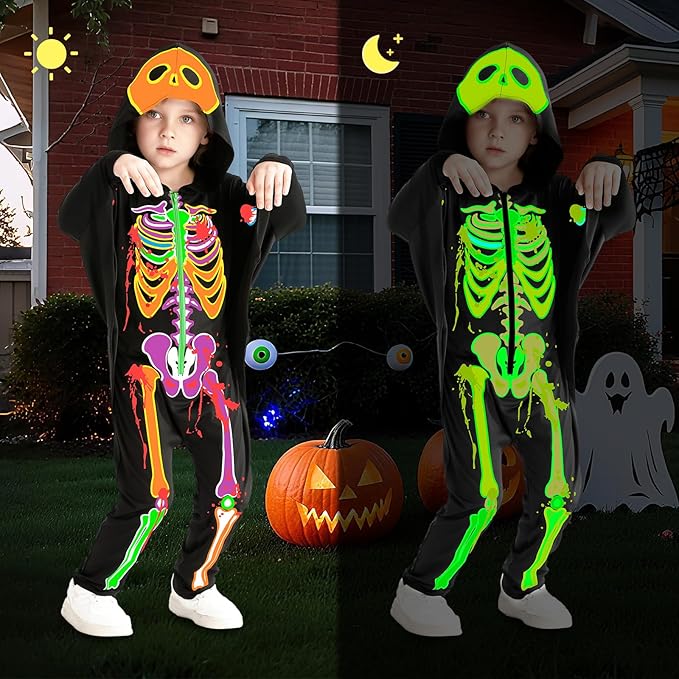 Світиться в темряві! М’який та зручний дитячий костюм скелета — ідеальний вибір для Хелловіну, карнавалу або вечірки перевдягання. Комбінезон з капюшоном з еластичного матеріалу, легко одягається та не сковує рухів.