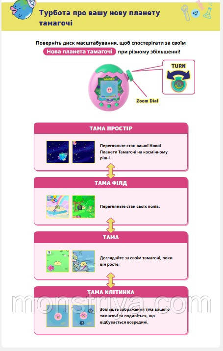 Новий рівень інтерактивності! Тепер виховання відбувається за допомогою поворотного циферблату ZOOM: просто обертай, доглядай і подорожуй між локаціями: від кімнатки до космосу 🚀
